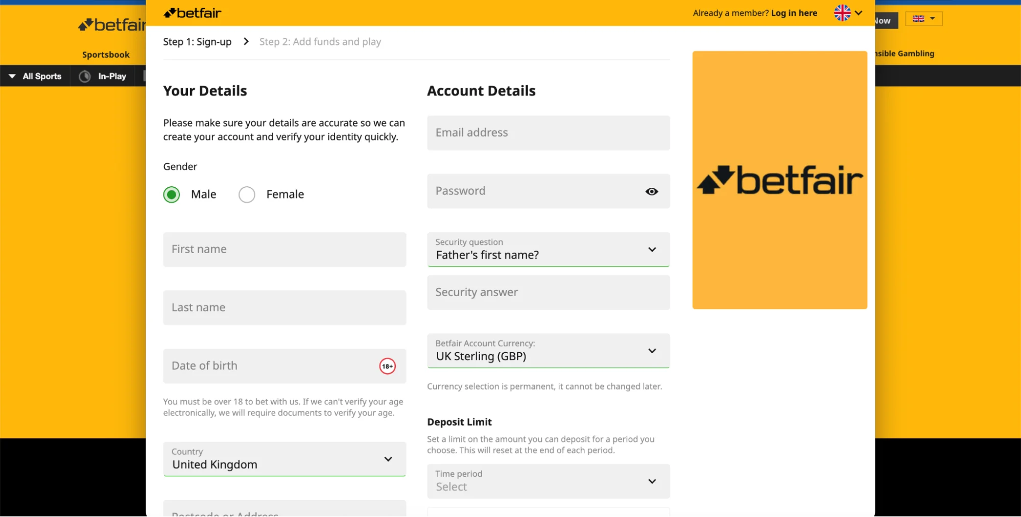 Continue the Betfair registration process by filling in the requested details.
