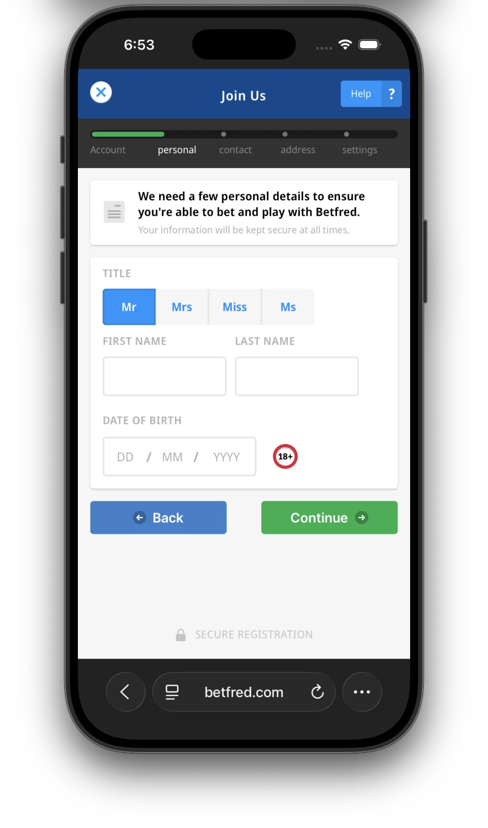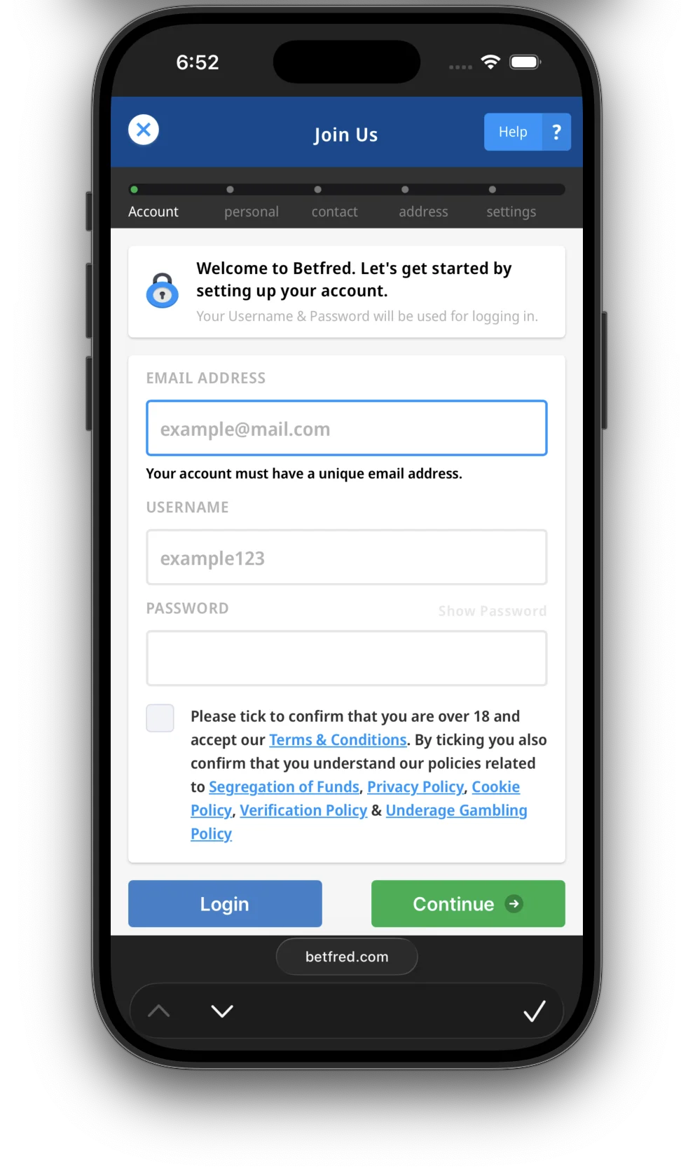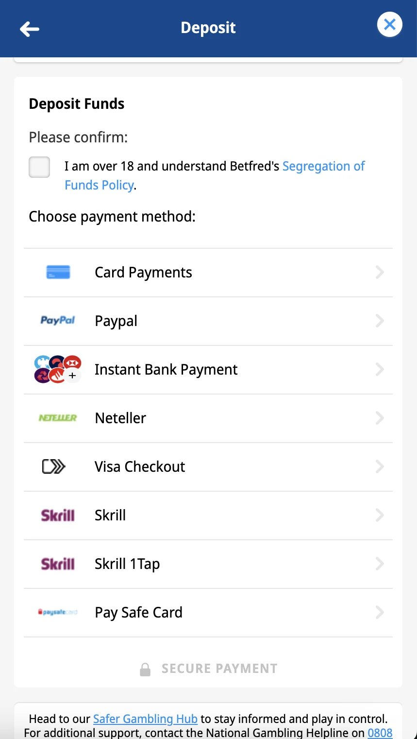 Tick the box confirming you’re over 18 and understand the Betfred Segregation of Funds policy.