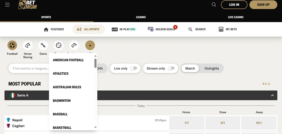 BetMGM customers enjoy a diverse and wide range of sports, from the most popular options to niche betting opportunities. Every sport includes the best competitions, teams, players and upcoming fixtures, meaning there’s always something to catch your eye.