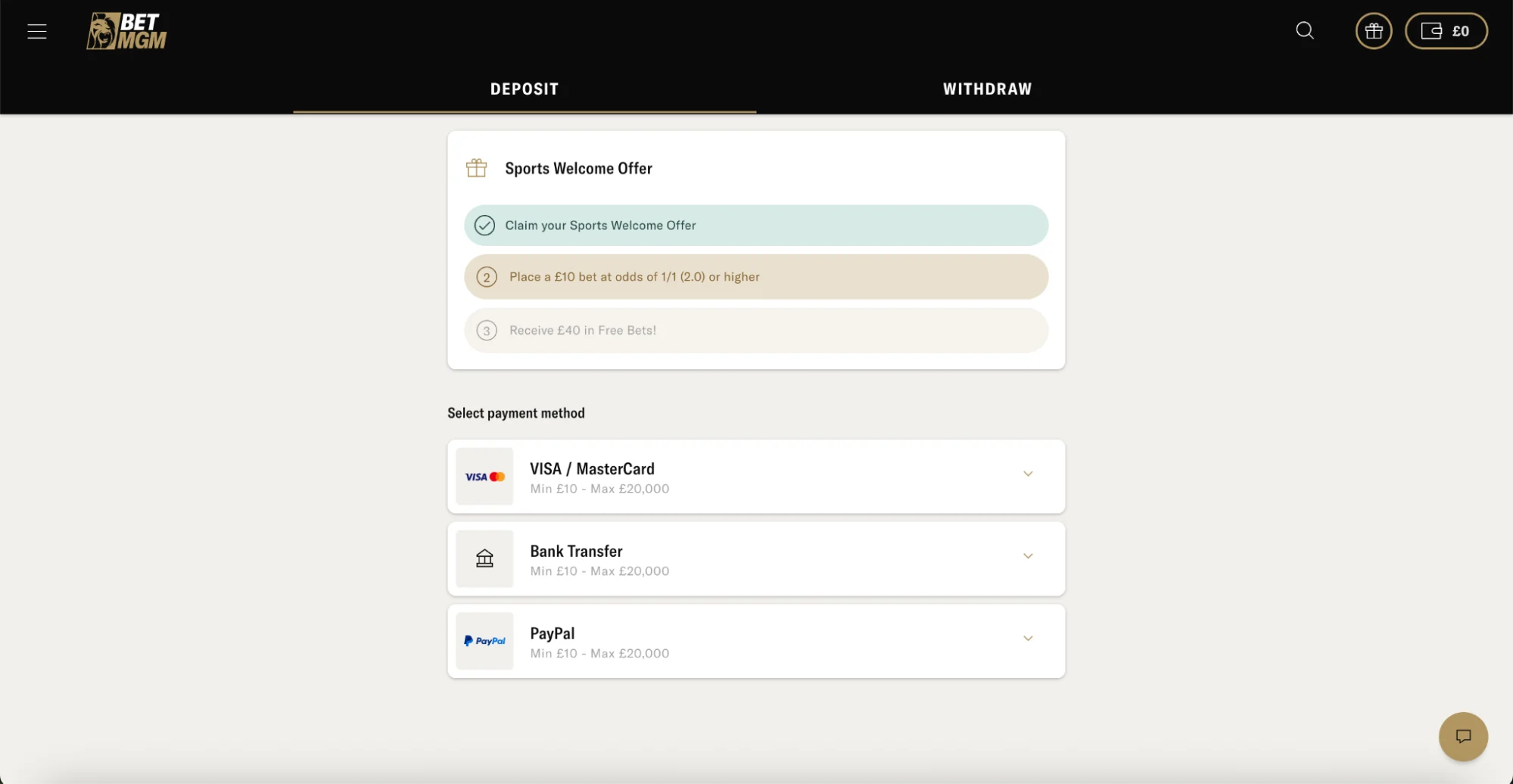 The minimum withdrawal amount at BetMGM is £10. It can depend on the withdrawal method, but the processing time can range from instant to three business days (for debit cards).
