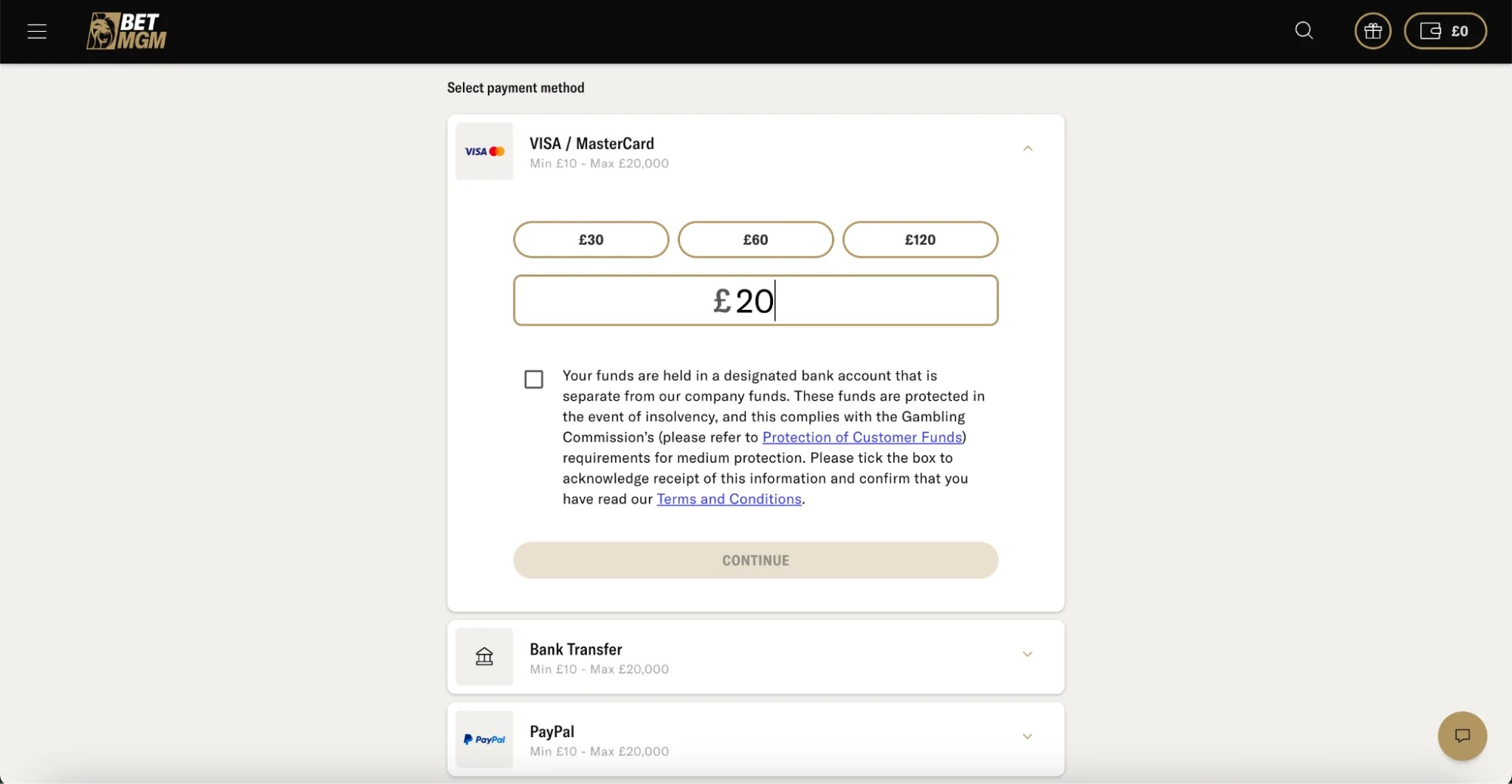 Select ‘Bank Transfer,’ enter a deposit amount, and tick the box before hitting ‘Continue’.