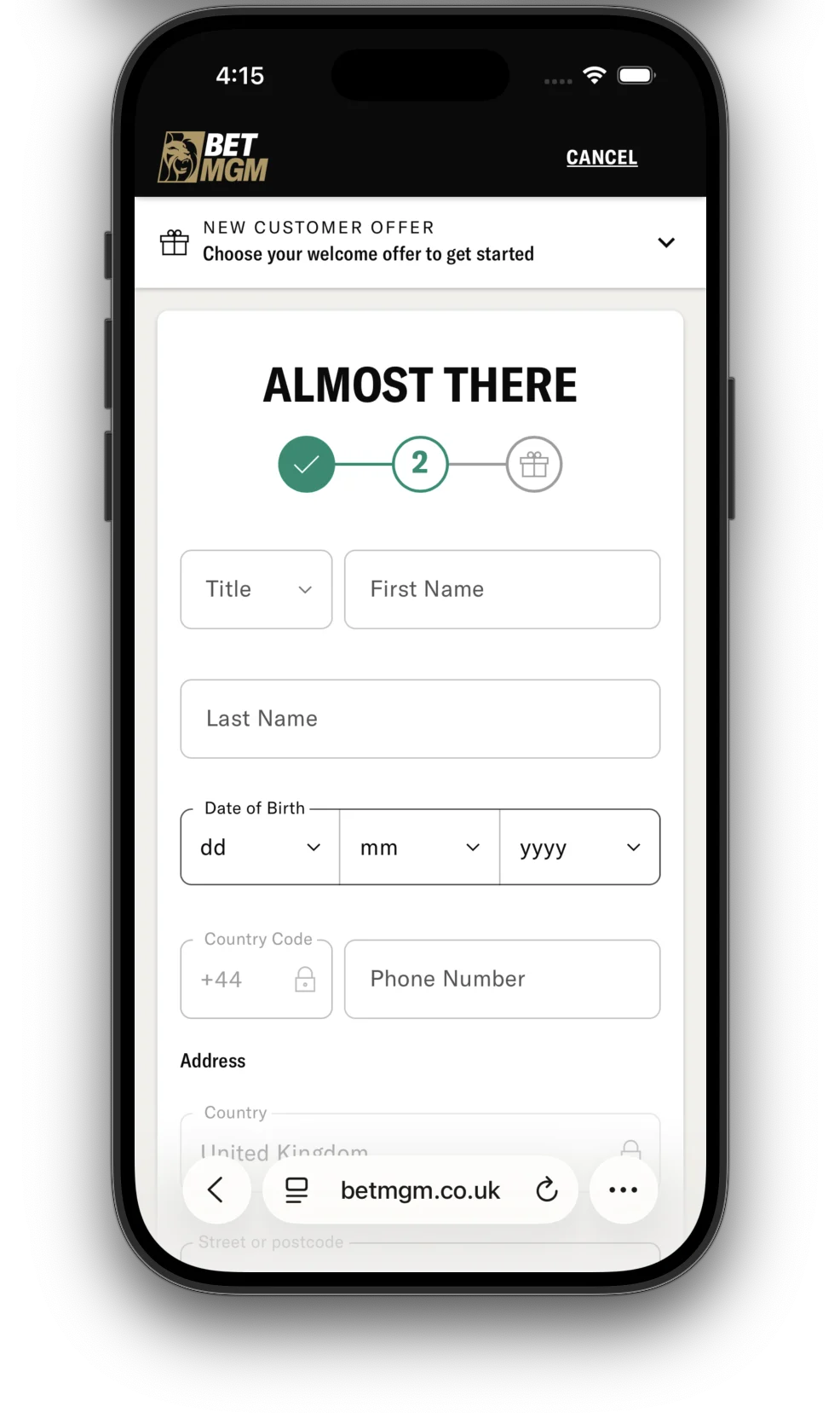 Enter your details to complete the BetMGM account registration steps (tick the box at the bottom to accept the terms and conditions.