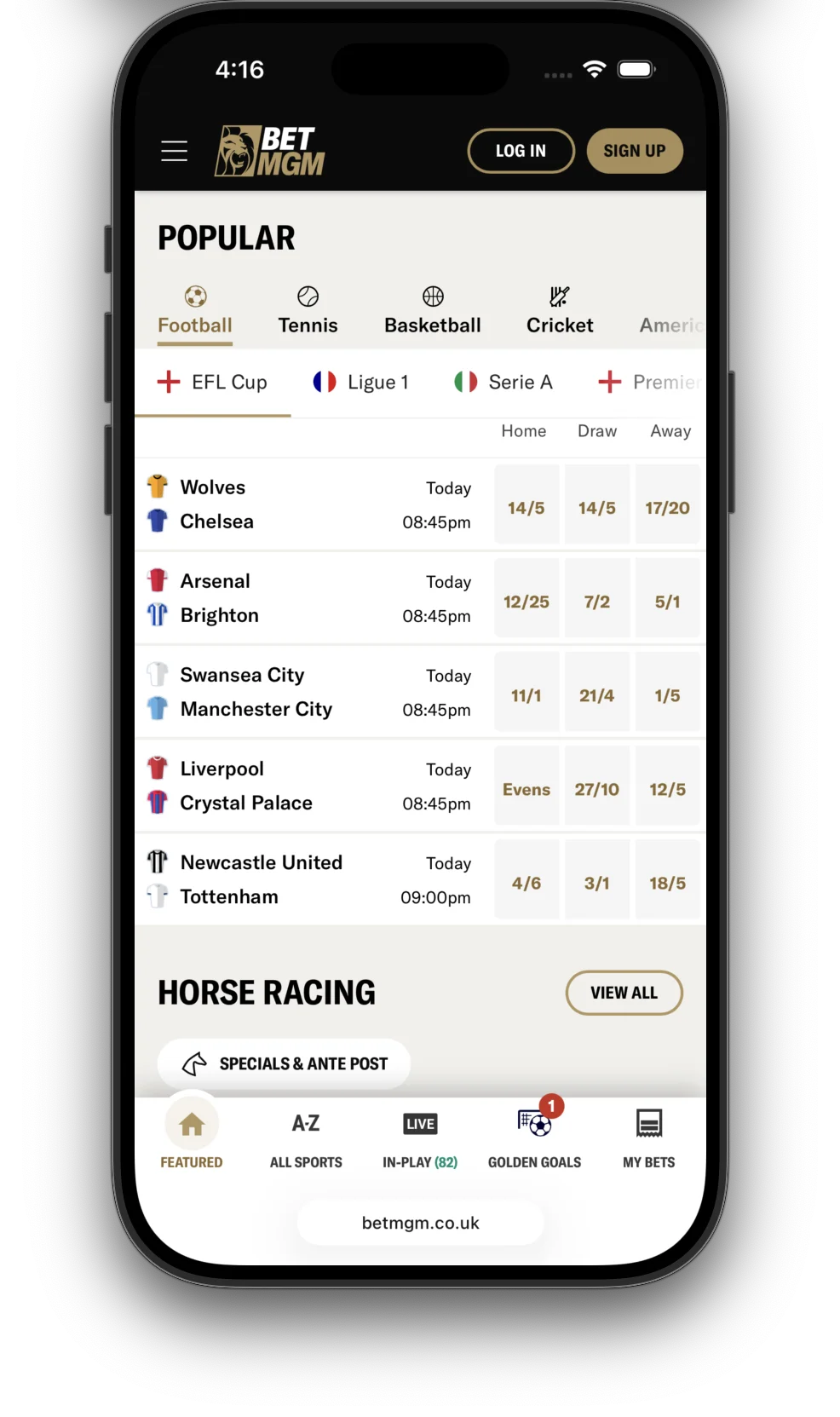 - Place a qualifying bet of £10+ at Evens (1/1) or above within seven days of opening a BetMGM account