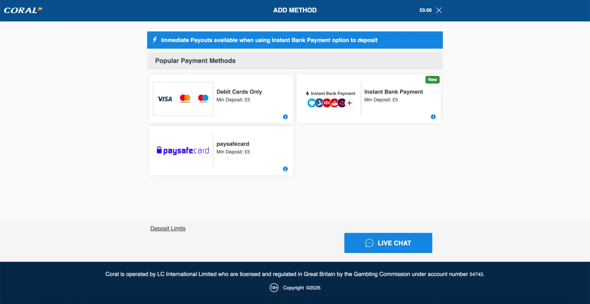 Coral aims to process withdrawals as quickly as possible. It can depend on the payment method selected, as can the minimum withdrawal amount.