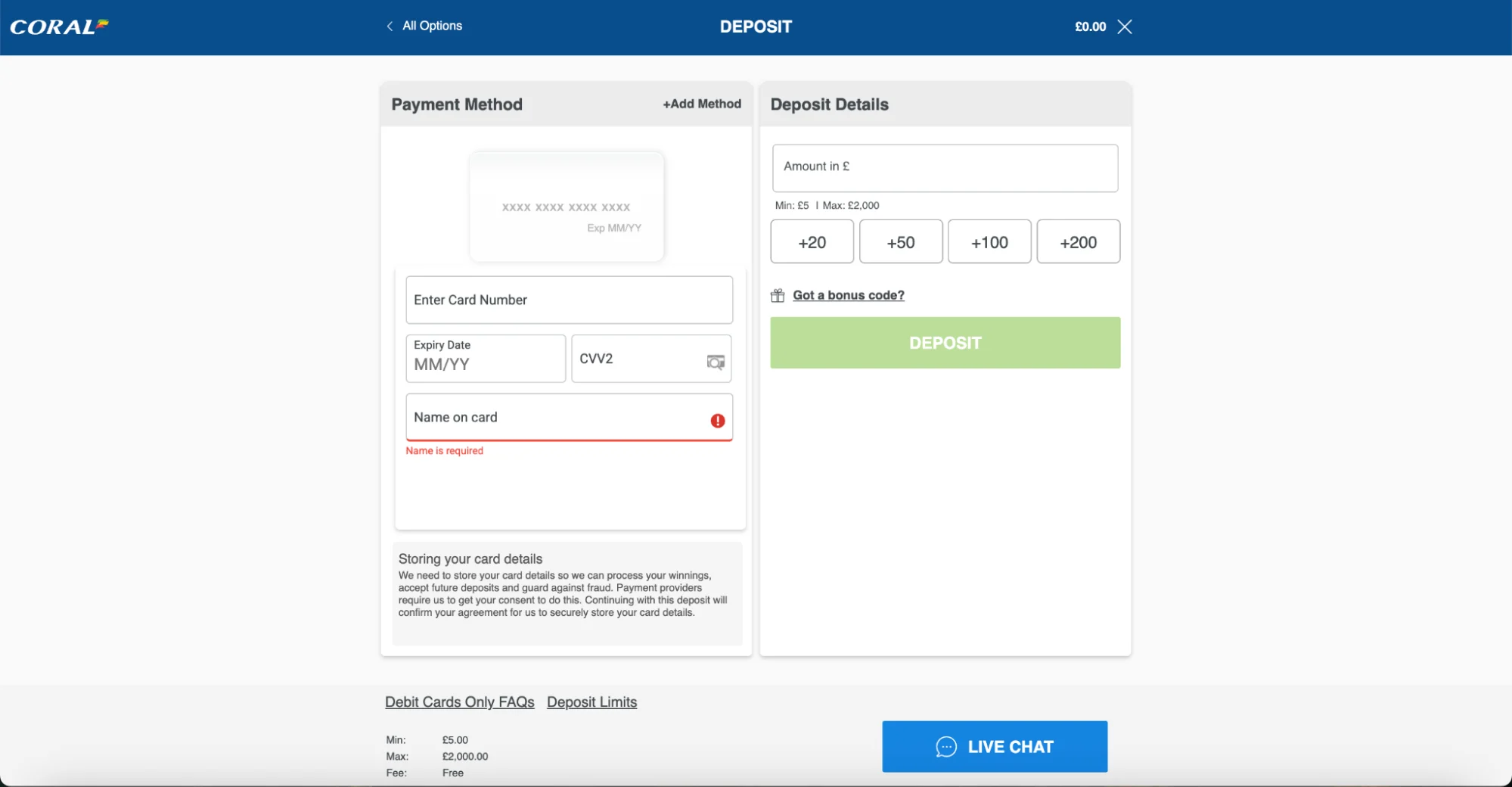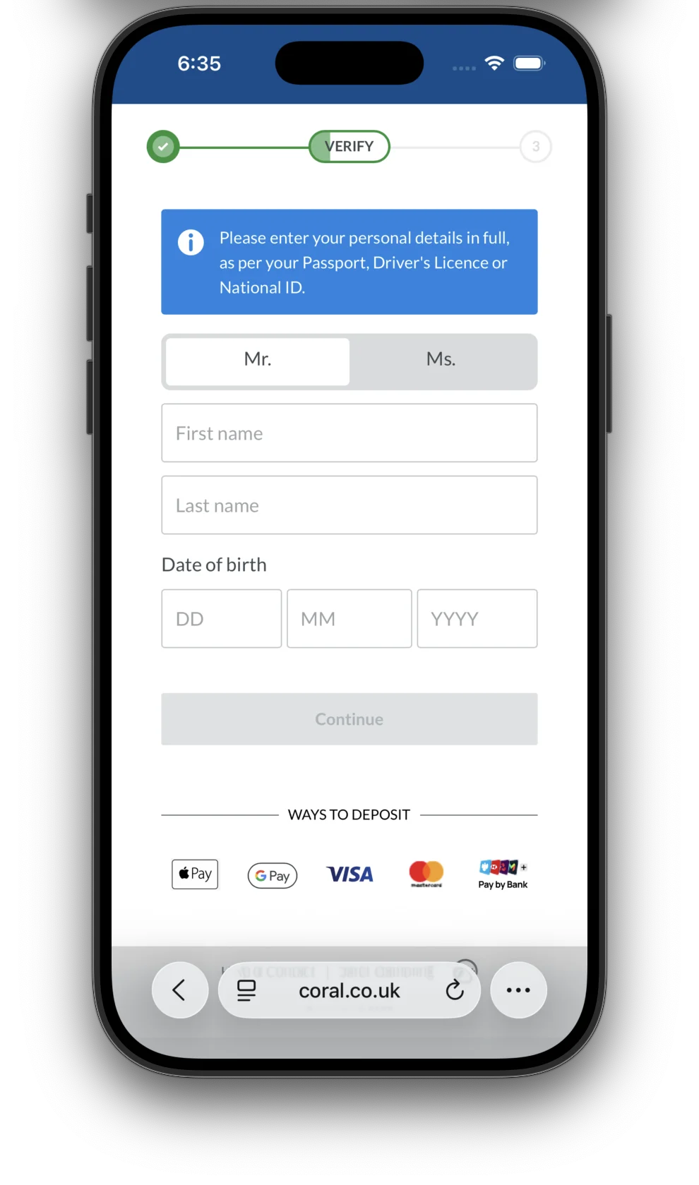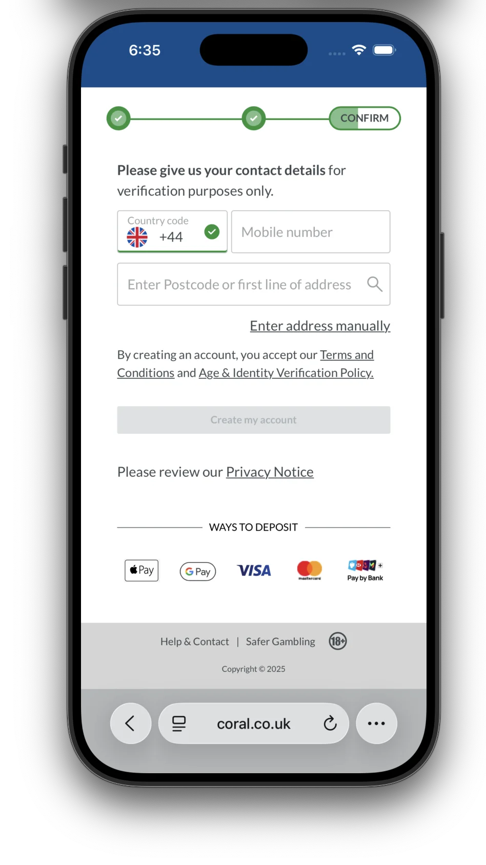 To open a Coral account, you must provide details that meet Know Your Customer (KYC) requirements. These are what casinos must carry out to confirm your identity and make sure you comply with legal requirements to play on the site.