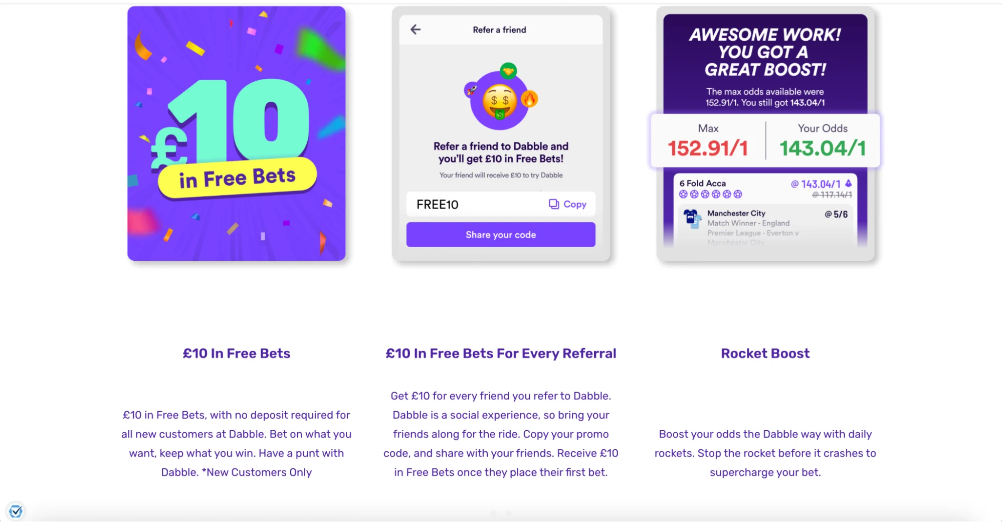The Dabble welcome bonus offers you a £10 free bet. Simply place a bet on a market that has minimum odds of 1/2 (1.5) within seven days.