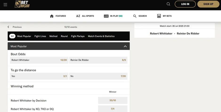 Looking for a way to bet with higher odds? The method of victory delivers. With this approach, you must predict which fighter will win and how they’ll get the result: on points, by submission, or by knockout. It’s more challenging than the fight-winner option, but the rewards are much higher. That’s the method of victory explained in a nutshell.