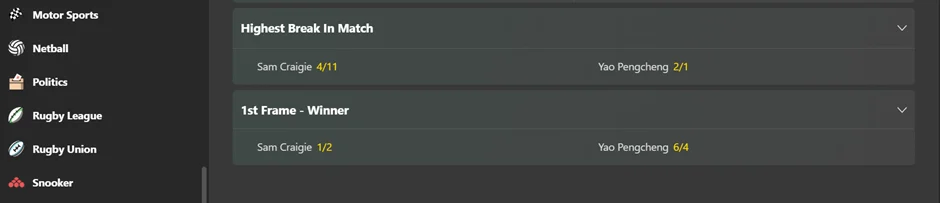 Sticking with the frames in our snooker betting guide, you’ll also see frame betting when browsing the snooker betting odds at your gambling app. A better way to think of frame betting is the correct score you might play in football or tennis. You’re gambling on the winning player and the result, such as Player A 10-7 Player B. If that’s the score, you secure the profits. That’s frame betting explained in simple terms.