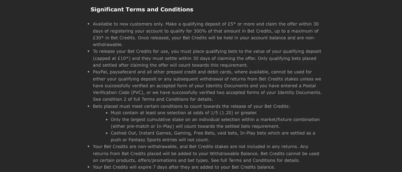 - Valid markets, and bet types: Check if it’s pre-match bets only, which markets are included, if you can cash out your bets, singles only, and more.