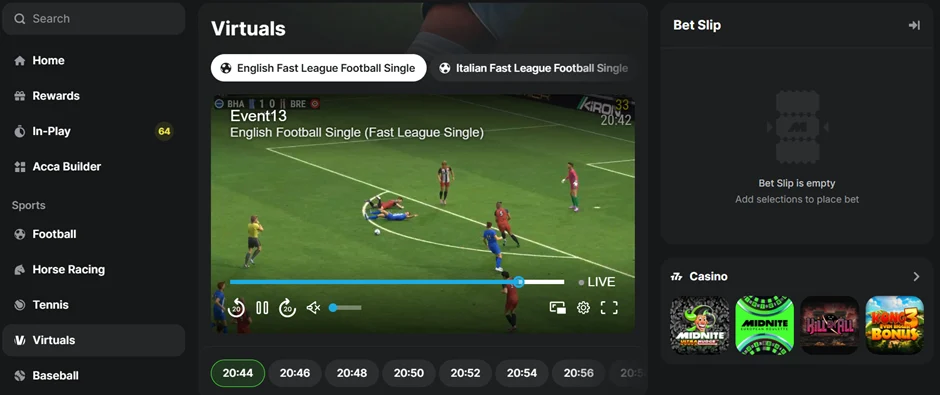 Virtual sports are available at most major bookmakers today, but few do it quite as well as Midnite. Bet on virtual football, tennis, greyhounds, basketball and the OG, virtual horse racing. Events begin every few minutes and are incredibly realistic. Give it a try today for a small stake and see what all the fuss is about.