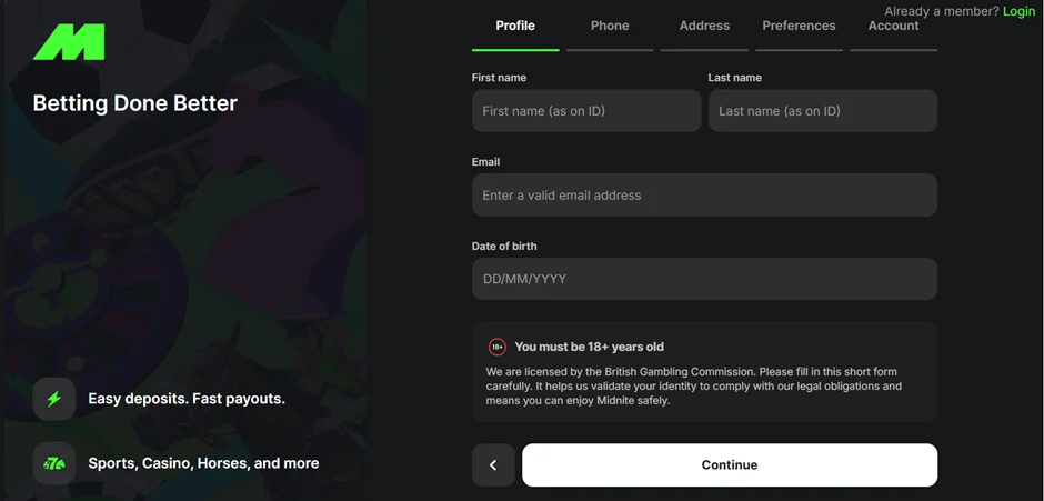 Account creation: How to Register and Start Betting With Midnite