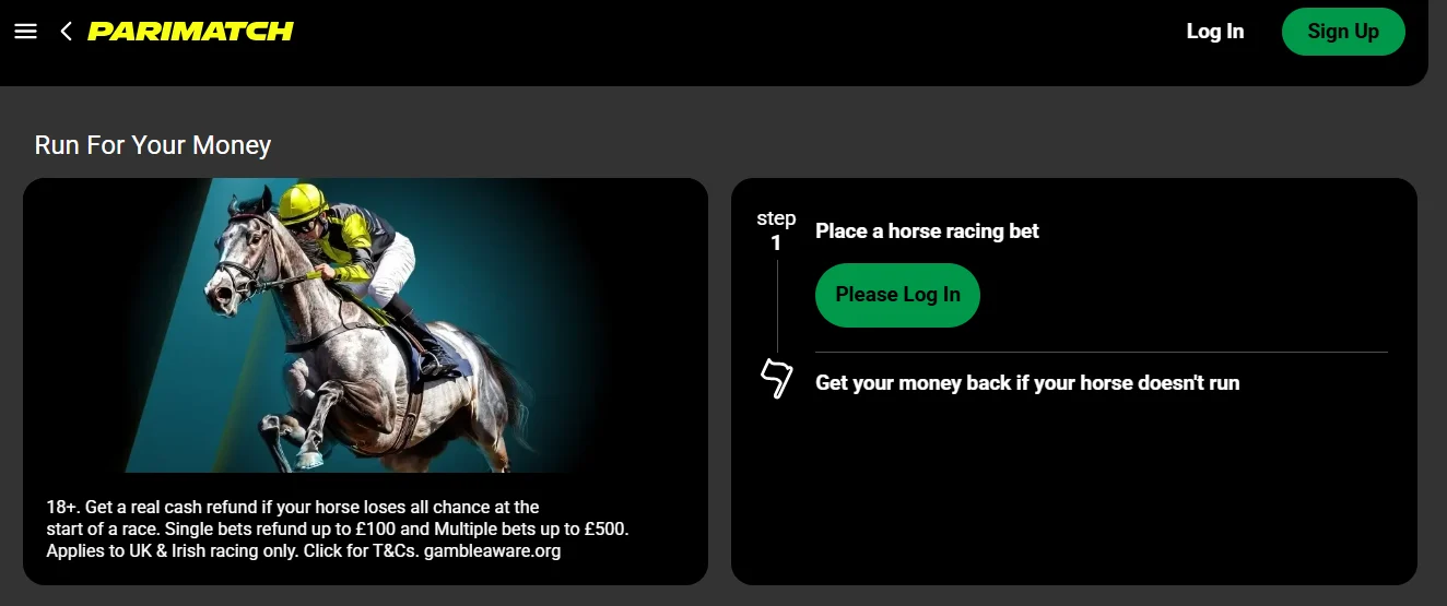 Bet on a horse from any UK/Irish race and Parimatch will refund stakes if your selection loses all chance of winning at the start. That includes non-runners and is capped at £100.