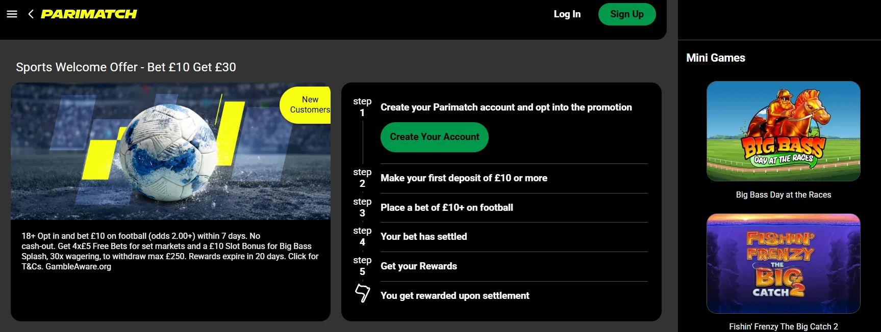 Register as a new player at Parimatch through this page, deposit and bet just £10 on football or sports, and you’ll automatically receive £30 in free bets. You can use your bet credits on the Premier League, horse racing, cricket, golf, tennis, and other favourites.