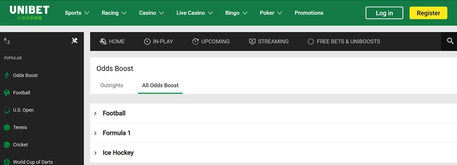 - Odds Boost: Unibet loves giving customers more, and they often boost the odds of popular selections. For example, you may find a higher price on the match-winner in football, a hot favourite in UK racing, or a podium finish in the next Grand Prix.