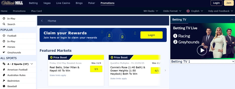 Football, horses, greyhounds, American Football, baseball, basketball, combat sports, motor sports, cycling, cricket, esports, darts, and golf are among the sports available. For a full list, see the William Hill website or app.