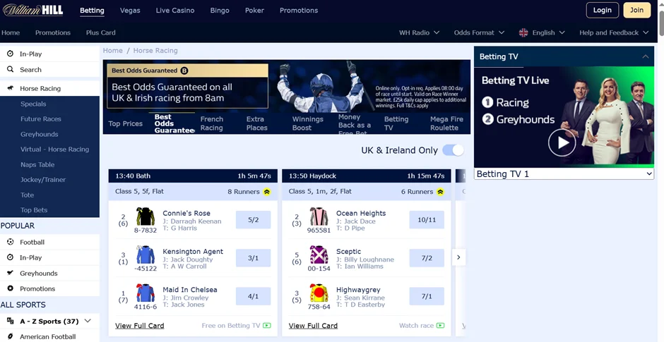 - Live streaming: One of my favourite features of William Hill is their free coverage of UK and Irish horse racing. Gamble on any of today’s races, and watch the action live on an HD-quality stream with expert commentary, stats, and betting odds. The live stream is available on the site and app.