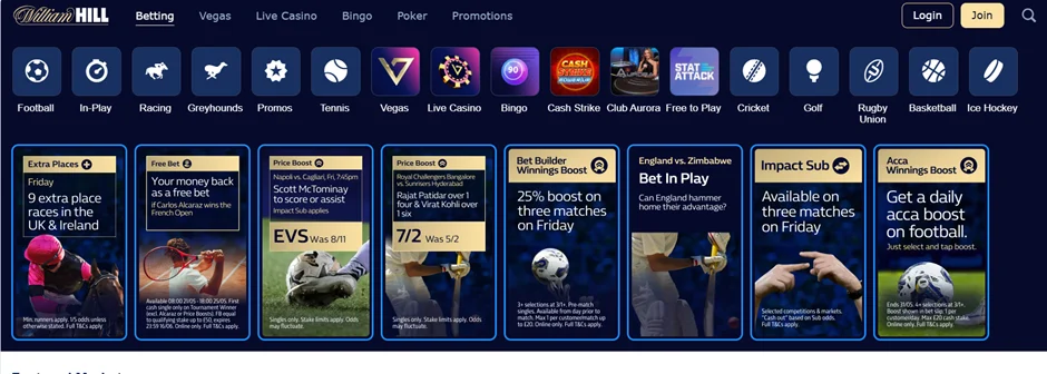 In addition to the welcome bonus, William Hill runs several recurring promotions and offers for existing members. These include free bets, price boosts, enhanced odds, cashback, extra places each way, and more. The marketing team updates their promos regularly, ensuring they are relevant, attractive and competitive. Check the William Hill promotions page for all of today’s deals.